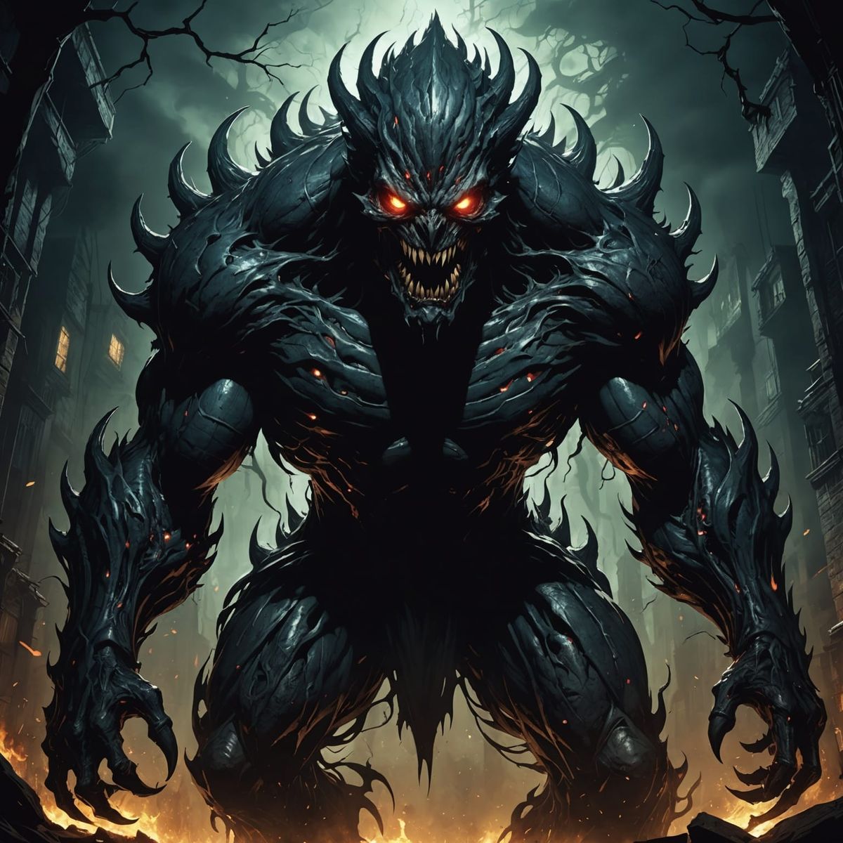 A terrifying monster emerges from a dark abyss. The creature has a glossy texture and is illuminated with cinematic lighting in a cel-shaded anime style.