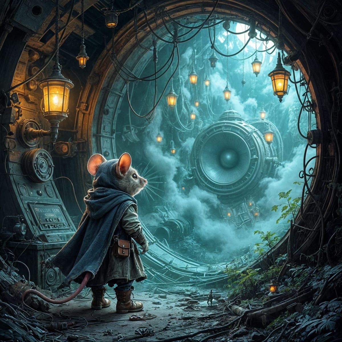 This image shows an anthropomorphic mouse dressed in worn clothing exploring the interior of a massive, derelict radio/gramophone. The scene is rendered in a hyperdetailed, ethereal fantasy style.