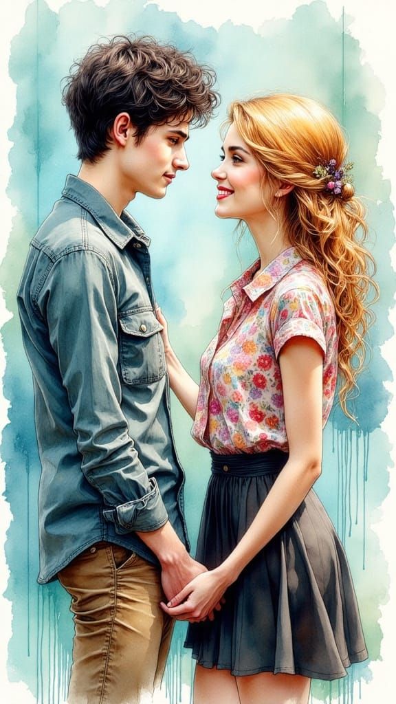 A vibrant ink drawing of a dark-haired man and blonde woman smiling at each other in a photo booth. The illustration features dynamic lines and soft textures in a whimsical style.