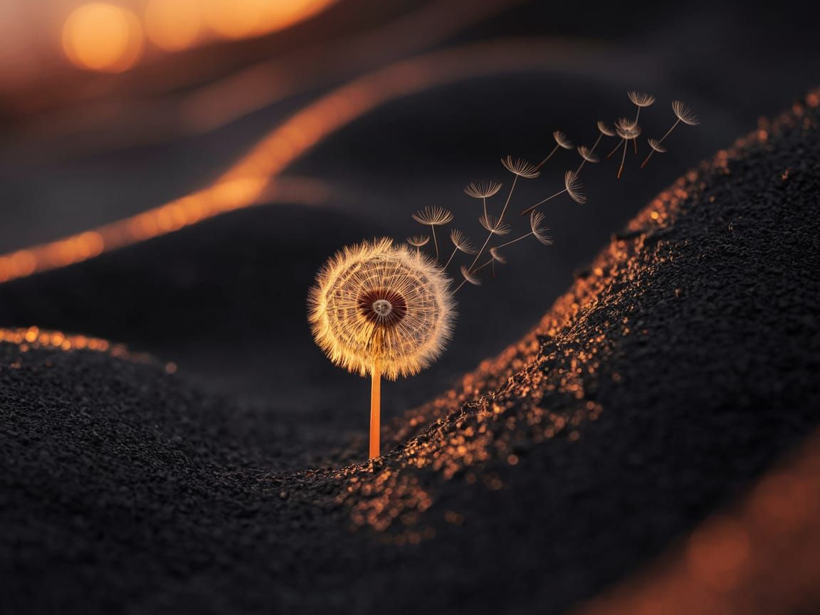 A photograph depicting "a single, luminous dandelion clock suspended in mid-air against a backdrop of swirling, obsidian volcanic ash," showcasing the stark contrast of delicate fragility and raw power. The dandelion’s seed head is bathed in the golden light of a setting sun, its countless seeds catching ...
