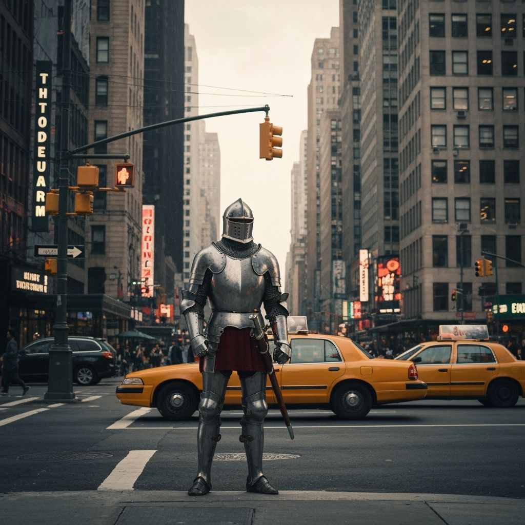 A medieval knight in full armor waits for a taxi on a busy New York street corner. The image evokes a nostalgic atmosphere with detailed cityscape and dramatic lighting.