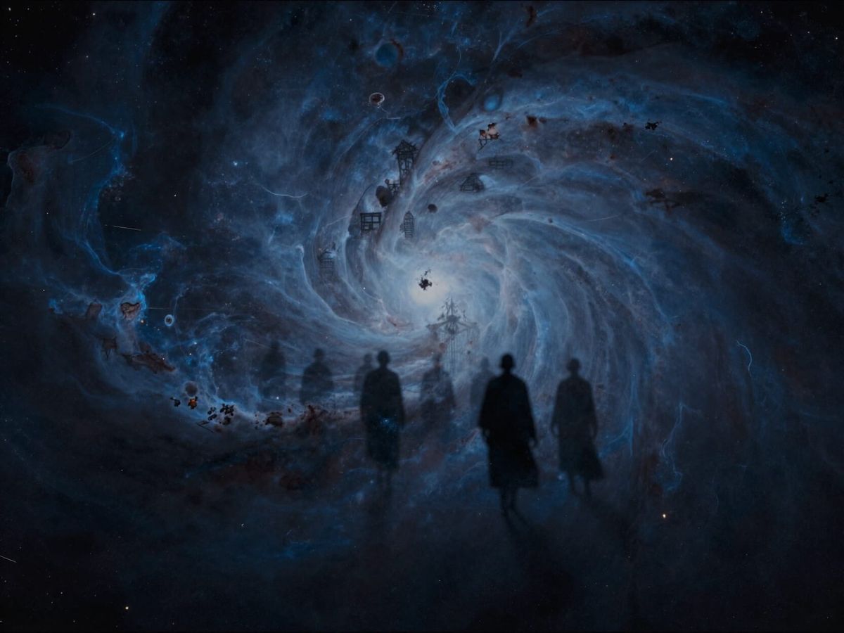 This image depicts a vast cosmic expanse of nebulae and dust, rendered in a dramatic, dark style with subtle blues and blacks. It evokes a profound sense of emptiness and the passage of all things.