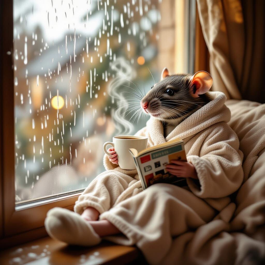 A photorealistic image of a rat wearing a bathrobe and slippers, enjoying coffee by a rainy window. Golden lighting and soft textures create a warm, inviting atmosphere.