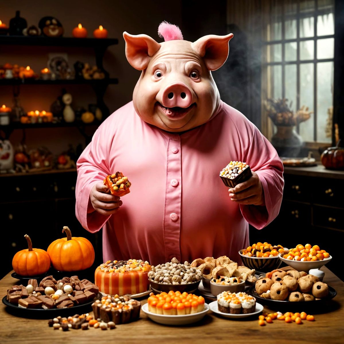 This image features a person in a detailed horror pig costume holding out various Halloween sweets like candy bars, candy corn, and caramel apples.