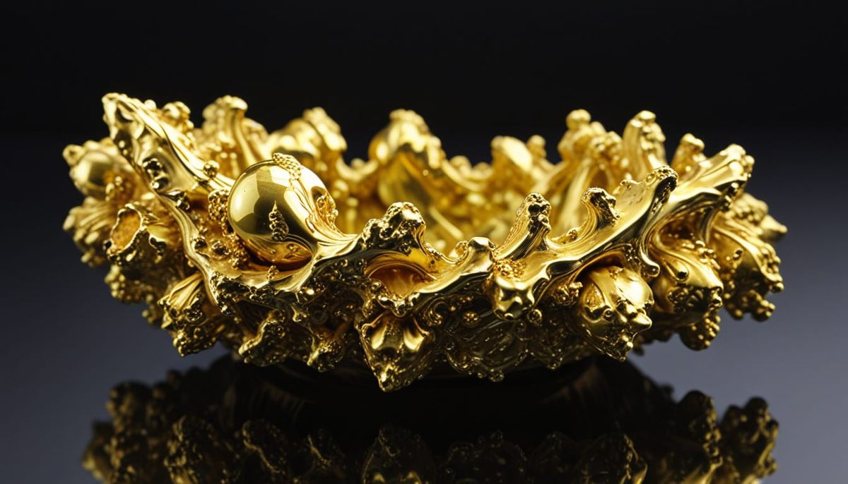 This image shows an abstract composition of gold, uranium, and gallium elements in a Baroque Gothic style. The artwork features intricate details and a rich color palette.