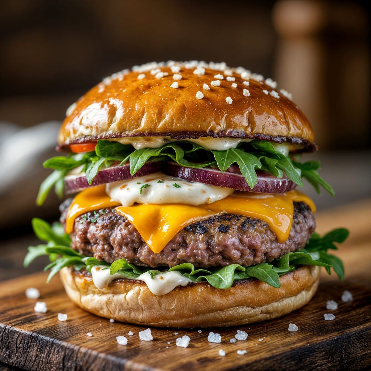 A close-up portrait of a delicious burger featuring a pink patty, melted cheese, arugula, and creamy sauce on a toasted bun, artfully presented on a wooden board with ambient lighting.