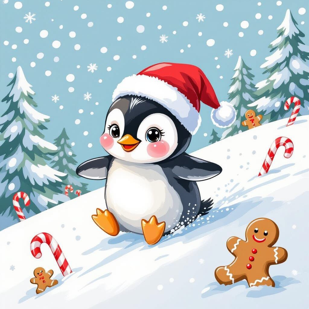 This image shows an adorable baby penguin wearing a Santa hat sliding down a snowy hill, leaving a trail of snowflakes. The scene is a vibrant watercolor winter wonderland.