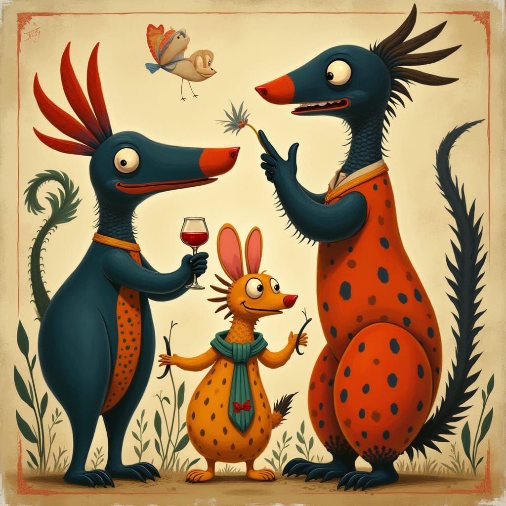 This vibrant artwork brings together anthropomorphic Italian Renaissance-style animals in a playful, rhyming scenario, blending the humor of Looney Tunes with the dynamism of Italian Futurism.