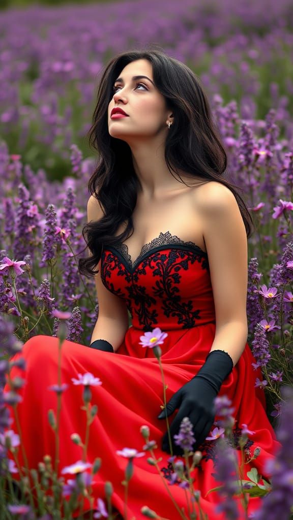 This image depicts a beautiful woman in a strapless gown, surrounded by a lush field of purple wildflowers, with a contemplative expression, in a style blending the elegance of Art Nouveau with the fantasy and romance of fine art illustration.