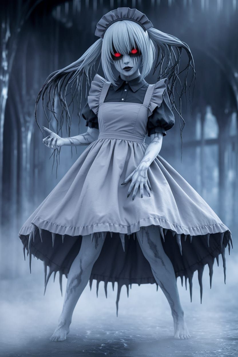 This image shows a hauntingly distorted 25-year-old woman with silver hair and black eyes in tattered maid attire. Dark tendrils of corrupted ice magic swirl around her in an eerie environment.