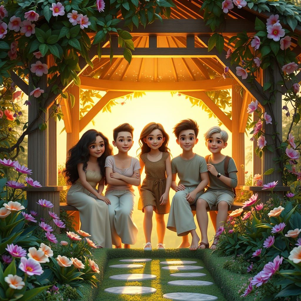 This image captures a group of friends hiding in a colorful garden gazebo at dawn, surrounded by blooming flowers, lush greenery, and a warm, golden light. The scene is filled with the songs of exotic birds and the soft rustle of leaves, evoking a sense of magic and wonder in a 3D digital art style remin...