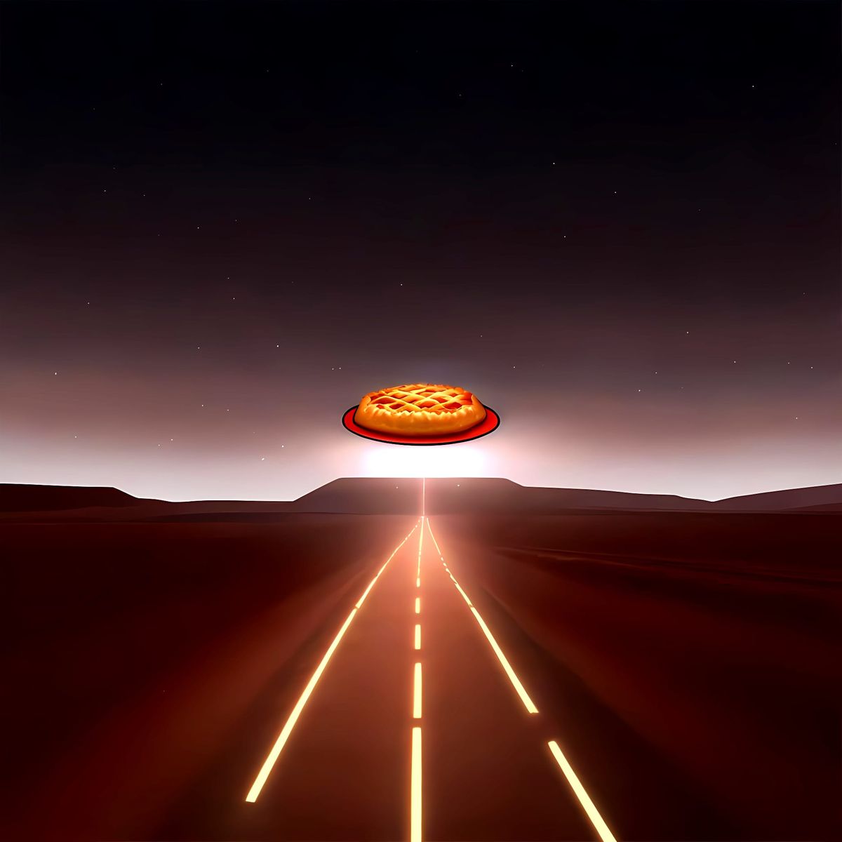 This image shows a chorizo pie in an empty Nevada desert. The anime-style picture features strobe lighting and a meaty red tint, hinting at opportunities in the distance.