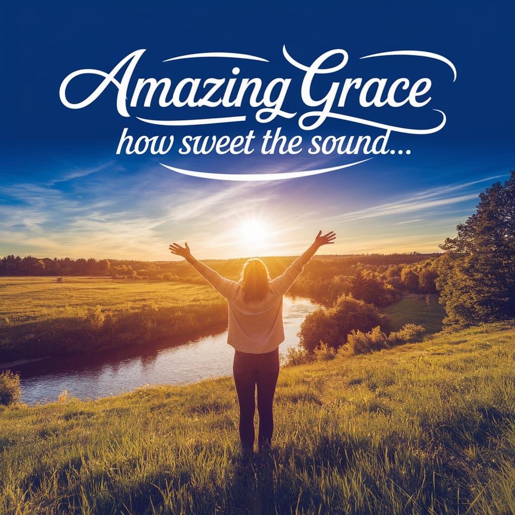 This image captures a serene moment of joy and gratitude, with a lone figure singing in a sun-drenched meadow under a vast sky, surrounded by a peaceful river and warm golden light.