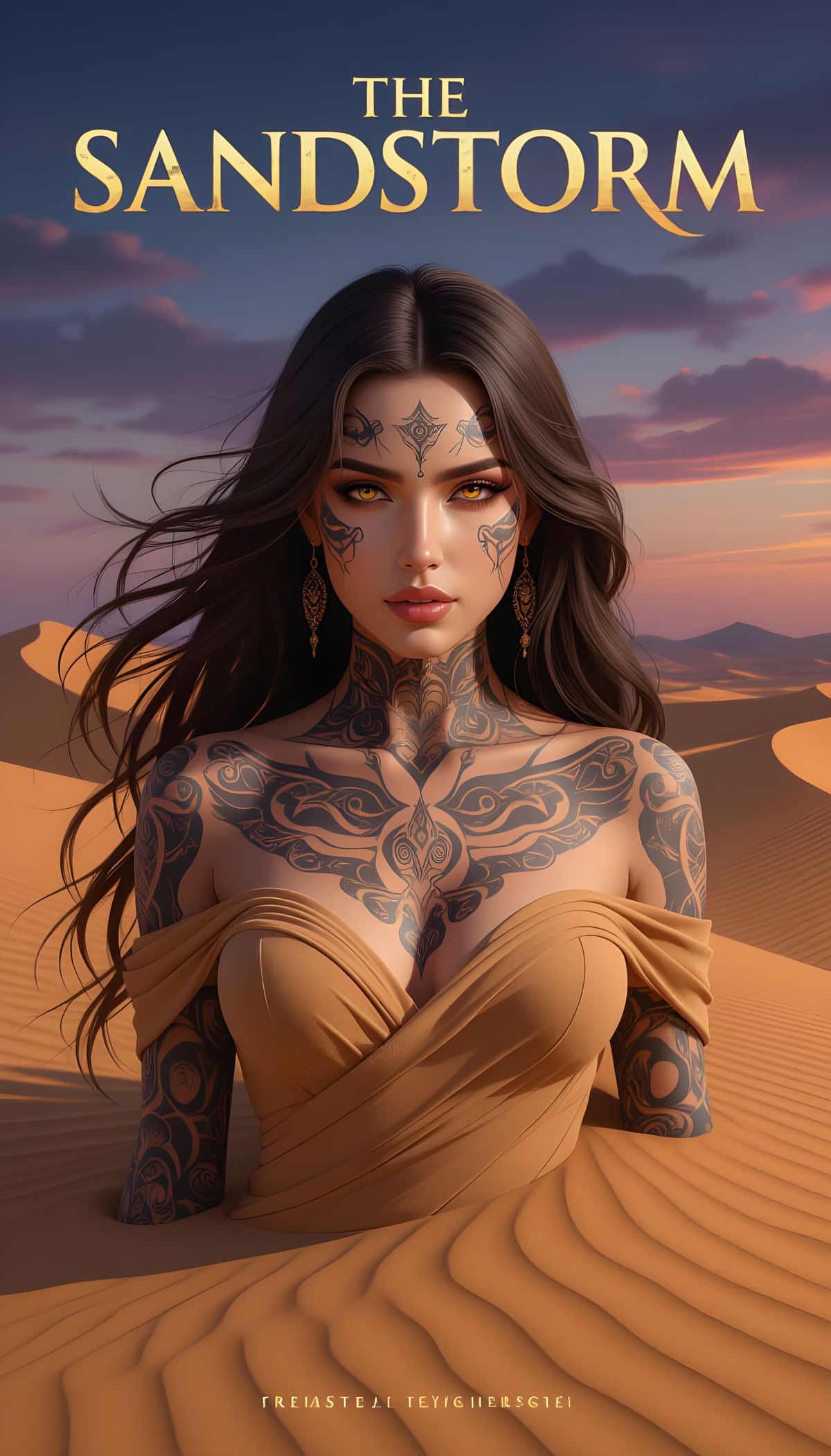 A captivating portrait of a beautiful supervillain known as "The Sandstorm". She stands amidst a swirling desert storm under a twilight sky, rendered in hyperrealistic fantasy art. Her intricate tattoos reflect the desolate beauty of the scene.