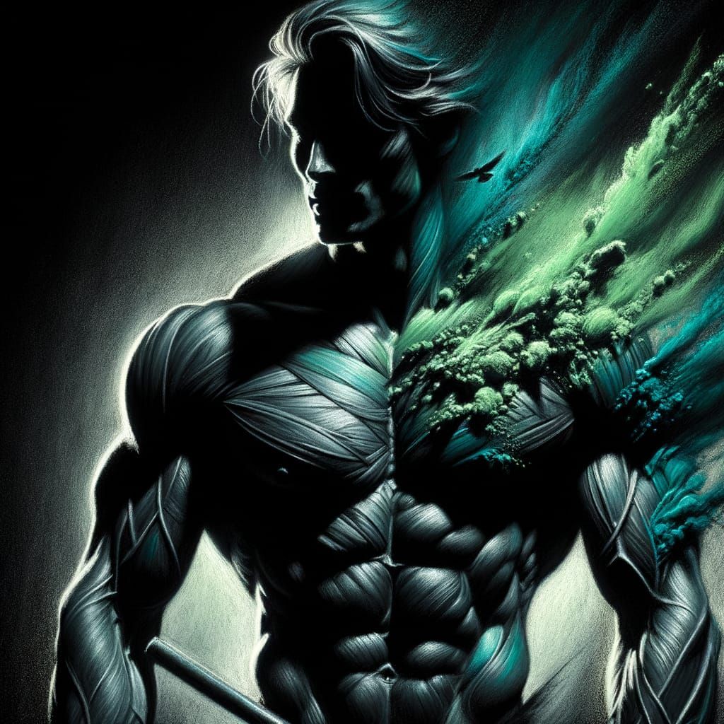 This image showcases a hyperdetailed charcoal drawing of a muscular warrior's silhouette. The figure is dramatically lit in dark green and blue tones, emphasizing a powerful physique.