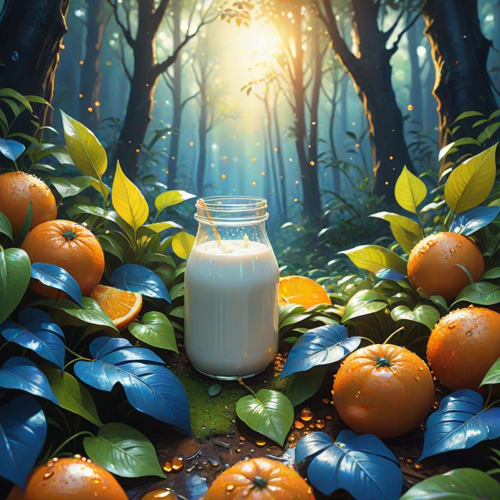 A vibrant oil painting of a World Plant Milk Day celebration in a lush forest. Golden light filters through the leaves, illuminating sparkling droplets in this detailed fantasy art.