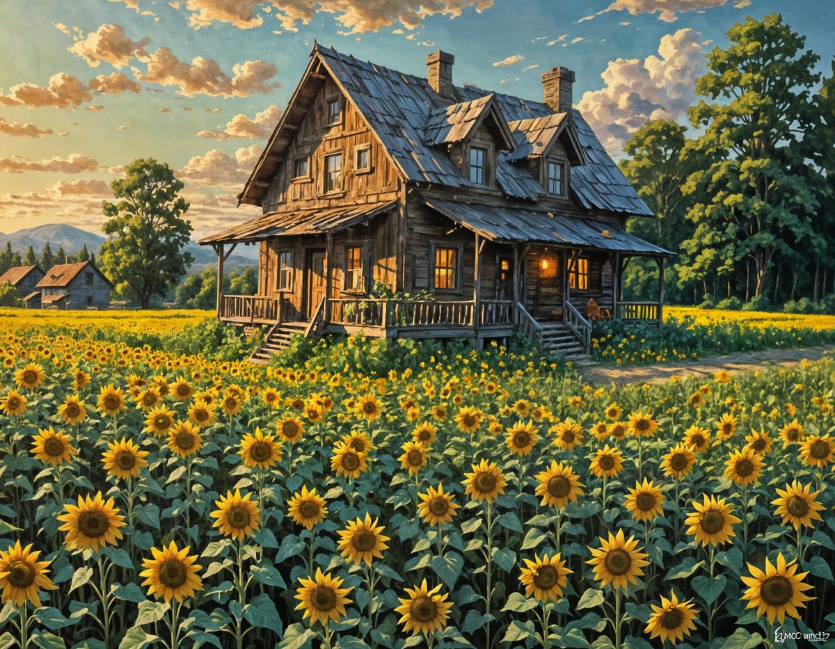 This image shows a charming cabin nestled in a vibrant field of sunflowers. The artwork has a cartoon-like quality, with intricate details and a moody atmosphere, as a digital painting.