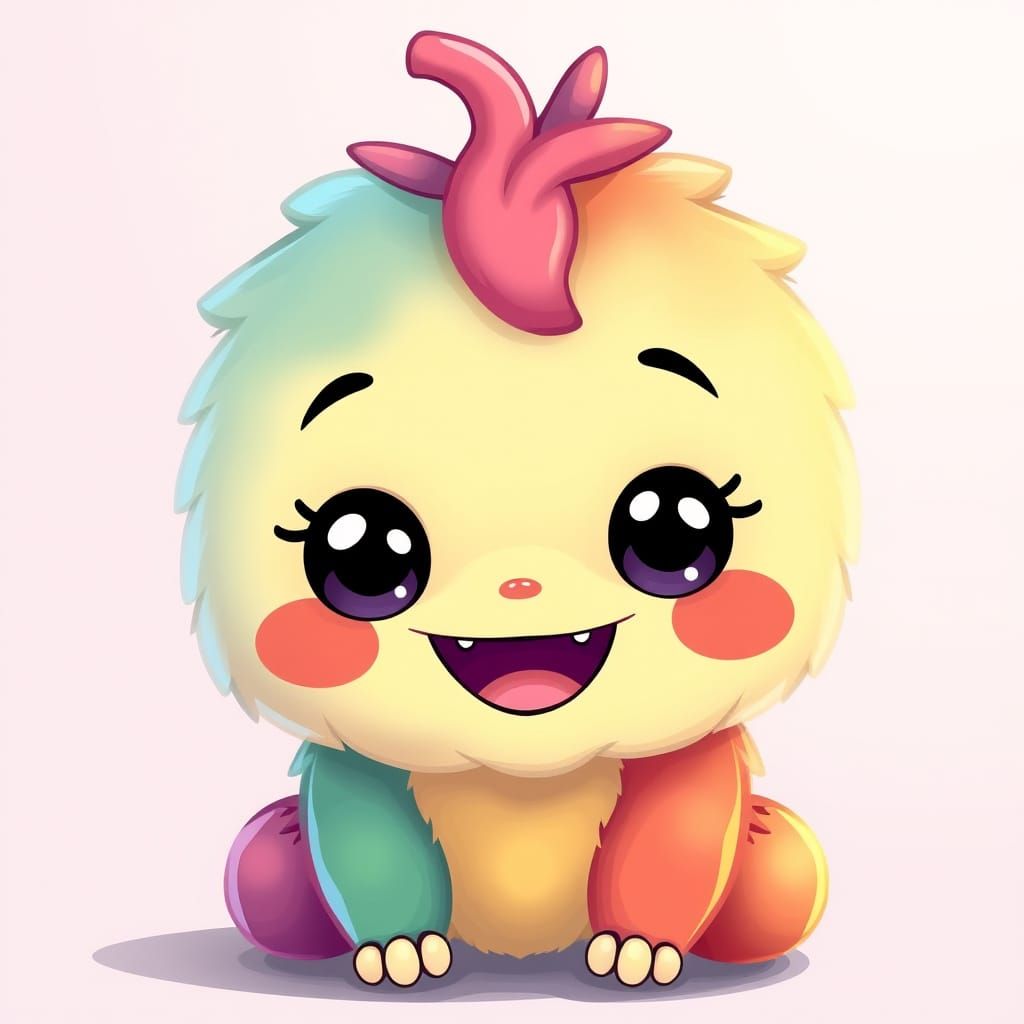 This image shows a cute, colorful creature with big, charming eyes and a joyful expression. The artwork embodies a kawaii aesthetic with soft shapes and a happy vibe.