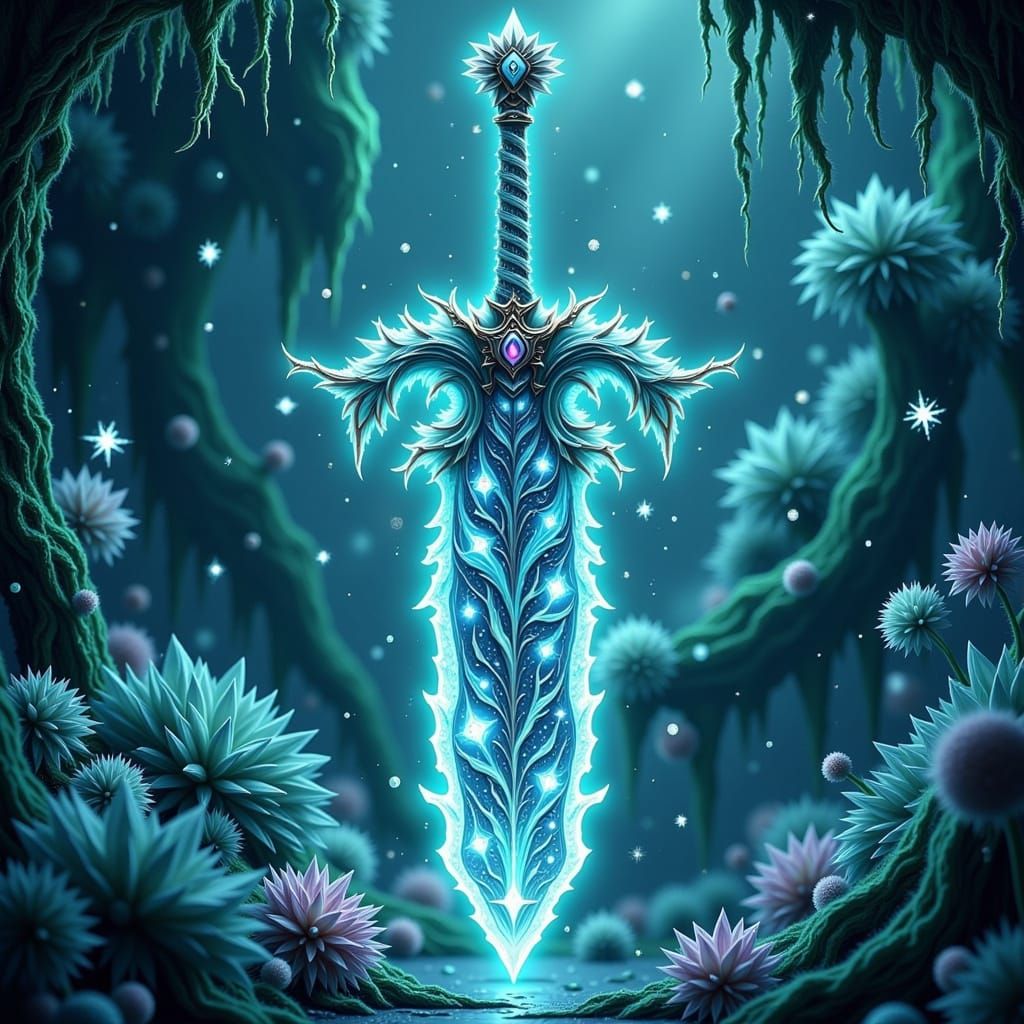 This image depicts a fantastical, otherworldly ice sword with shimmering, iridescent scales and a wild, fur-like wrapping around the hilt, set amidst a dreamlike, alien landscape with glowing, crystalline formations and deep blue-green foliage.