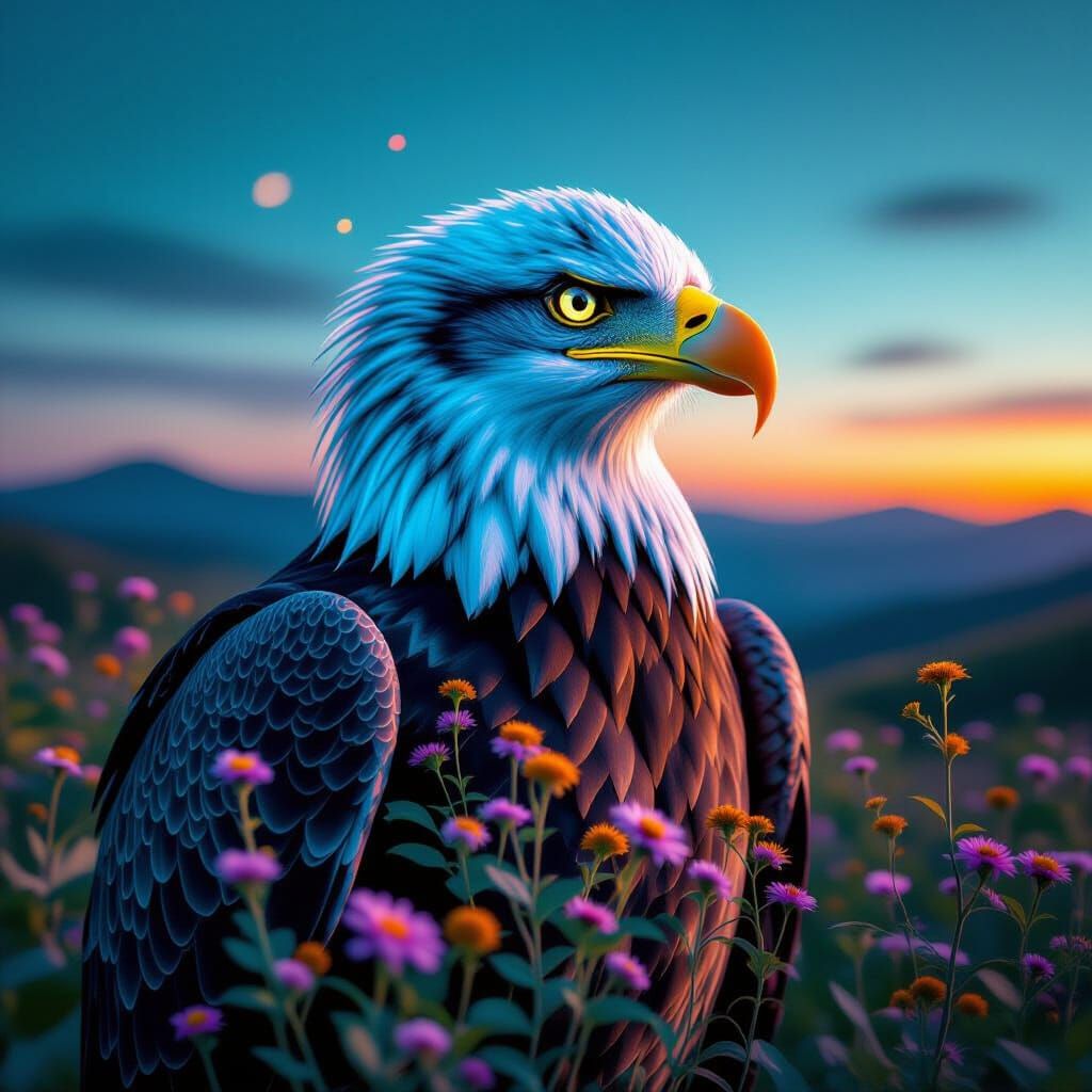 This image shows a neon portrait of an eagle set against a vivid landscape. The artwork uses a multi-layered double exposure technique with glowing green, amber, and soft purple neon light to create a surreal aesthetic.
