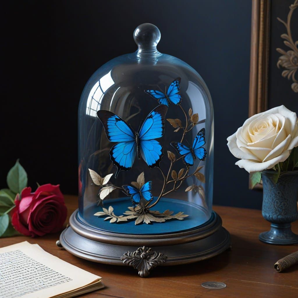 This image displays a butterfly preserved under a glass dome on an antique desk. The scene includes scrolls, ink, and roses, rendered in dark, soft gothic hues.