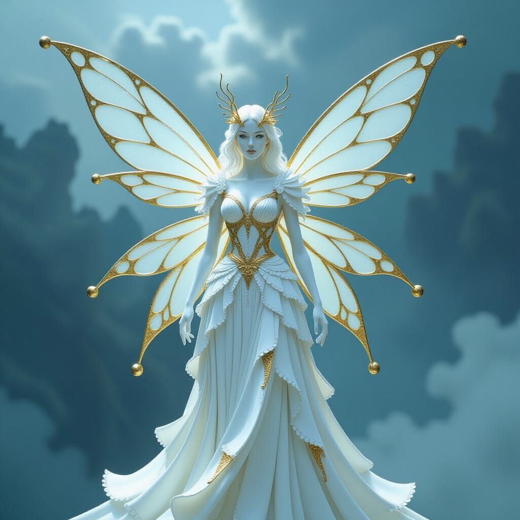 A striking picture of a fairy assembled from white clay fragments, joined with gold. The fairy exudes a calm power against a dramatic backdrop, as epic cinematic digital art.