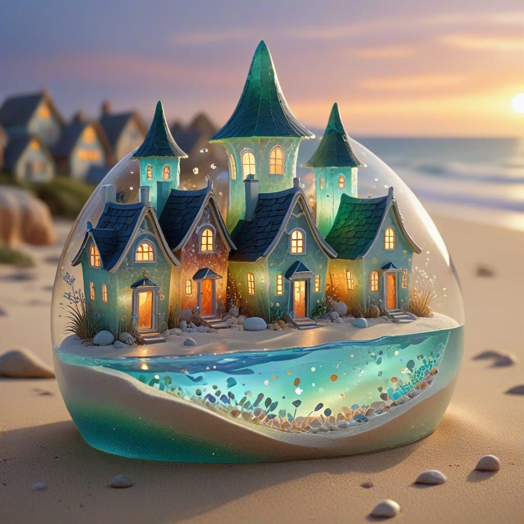 This image depicts a fantastical village made of iridescent sea glass cottages on a sandy beach, illuminated by the warm glow of a setting sun. Rendered in a pastel color palette with intricate details.