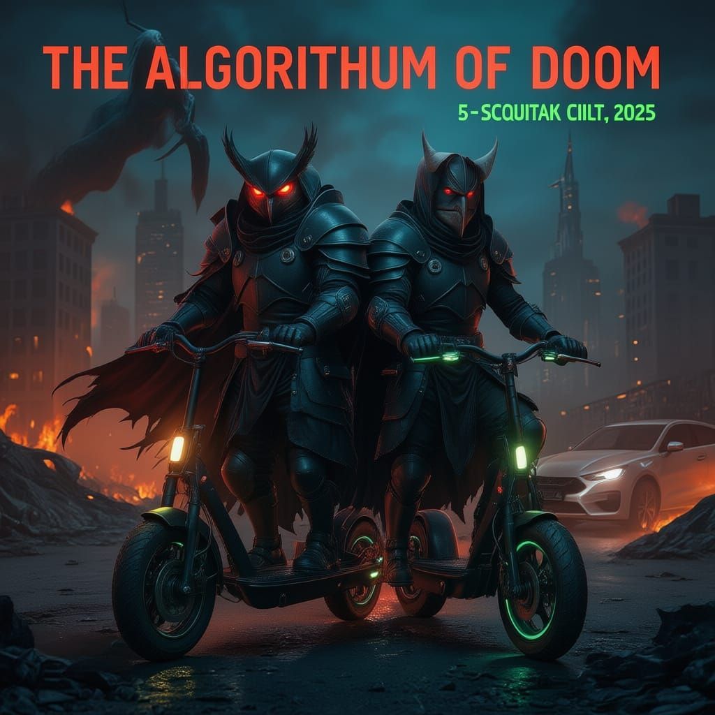 This image shows a demonic owl knight standing on a Xiaomi e-scooter amidst a burning cityscape. The design features glowing red eyes, dark armor, and pixelated text with intense red and green accents.