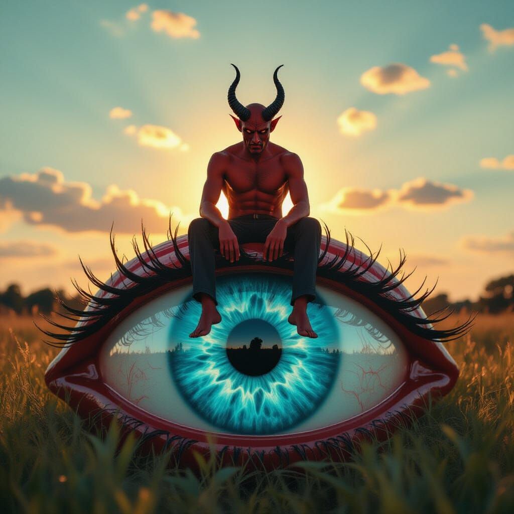 This image shows a dark red demon perched on a massive, luminous blue eye, rendered with vivid summer colors and a vintage photography style.