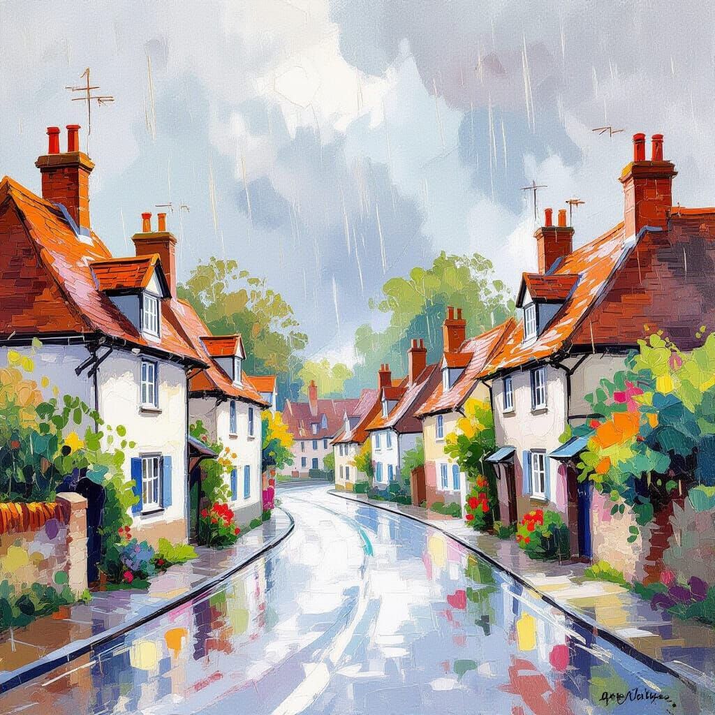 A vibrant gouache painting of a quaint English village in heavy rain. The artwork features thick brush strokes and dynamic movement, reminiscent of impressionist masterpieces. Rendered with a matte painting finish.