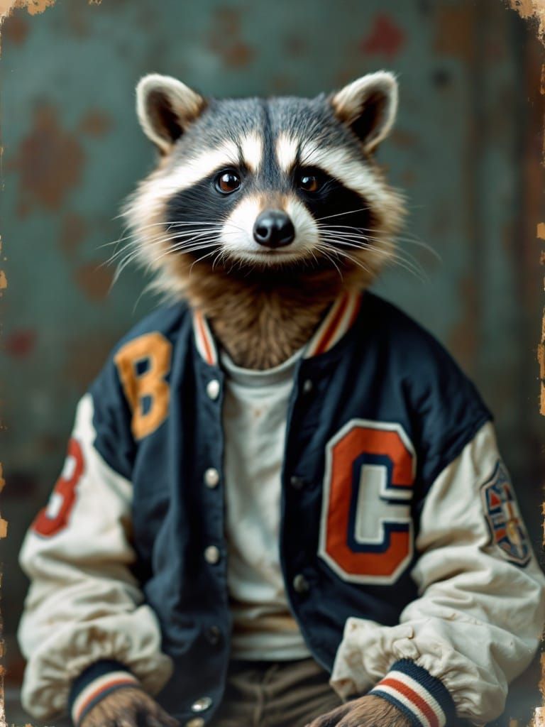 This nostalgic image captures a raccoon dressed as a football player in a worn, vintage letterman jacket, surrounded by the subtle textures and soft focus of an 80's-style high school ID photo, with a touch of painterly flair.