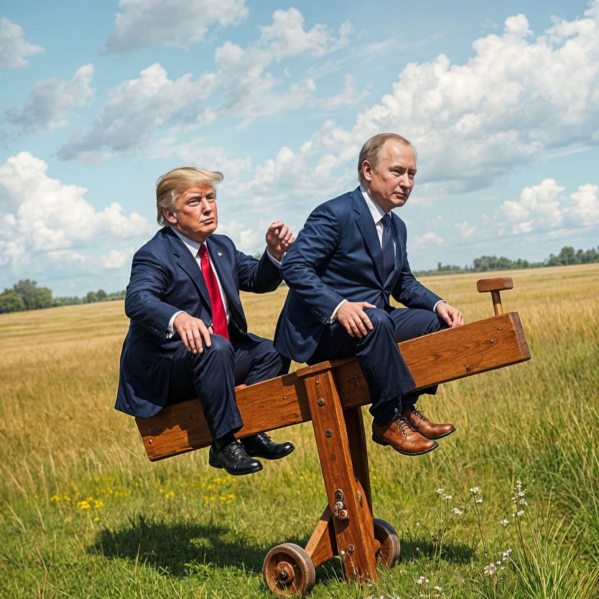 This image depicts Donald Trump and Vladimir Putin on a seesaw. The artwork presents a political concept in a simple, visual way.