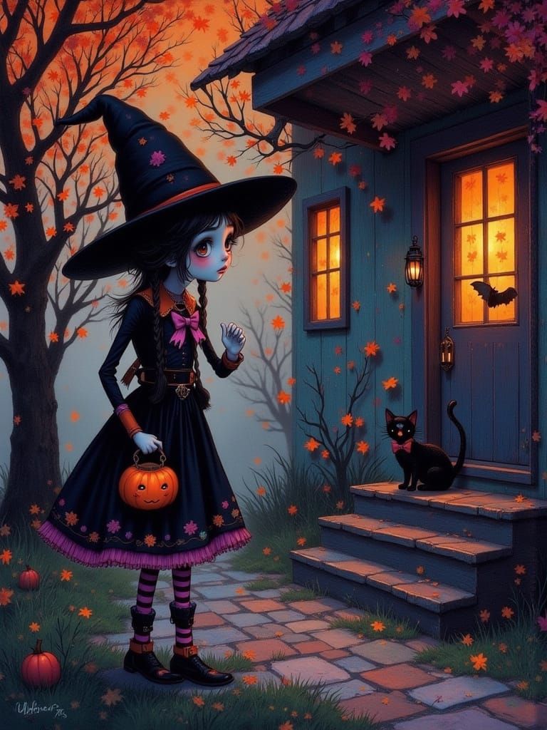 This image depicts a cute witch girl in a gothic dress, holding a pumpkin handbag, with a black cat. She stands outside her home under an autumn tree, talking to Jason Voorhees, rendered in a luminescent gel pen and chalk art style.