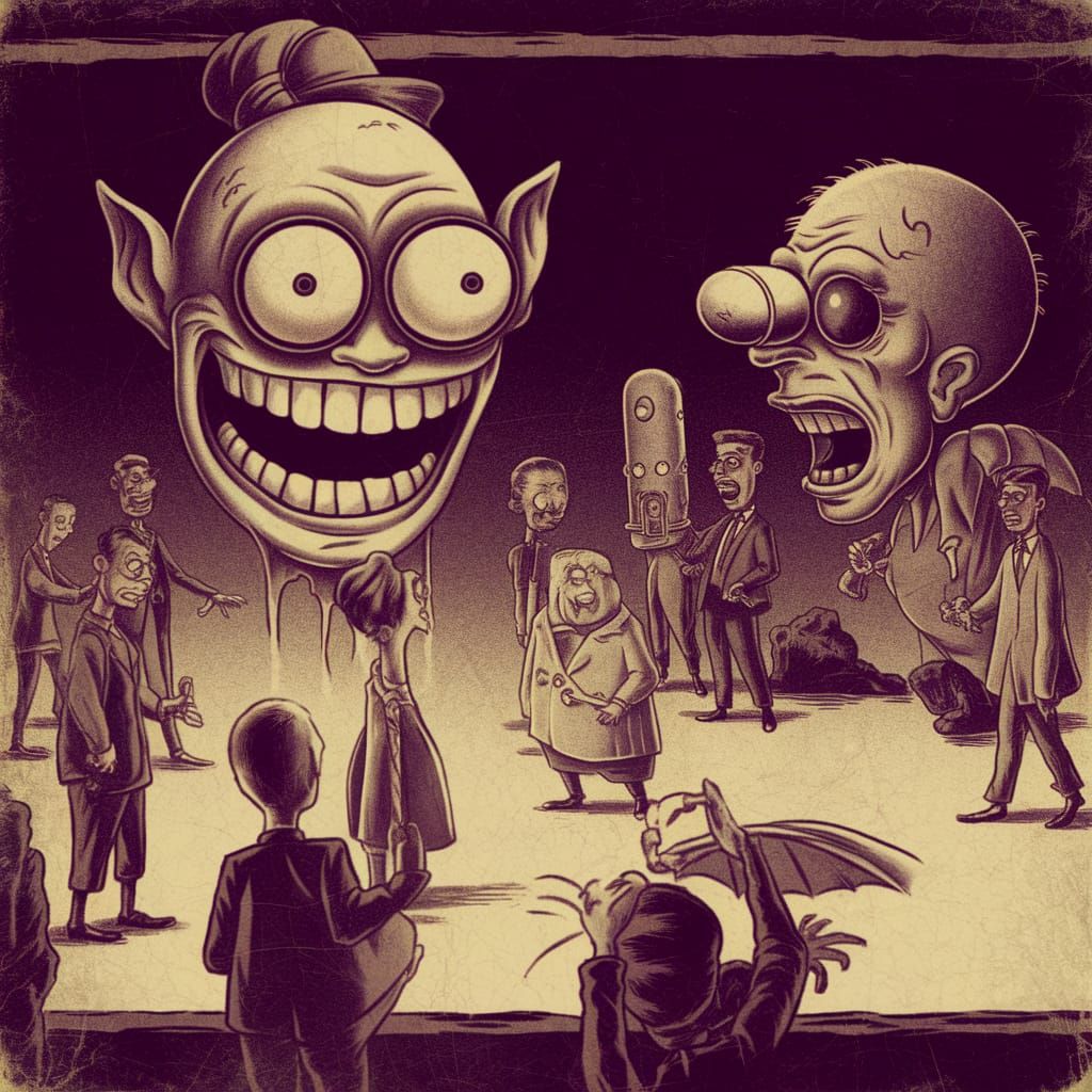 Easily generate your own disturbing 1930s cartoon images, inspired by classic animation cells and unsettling themes. Free and easy!