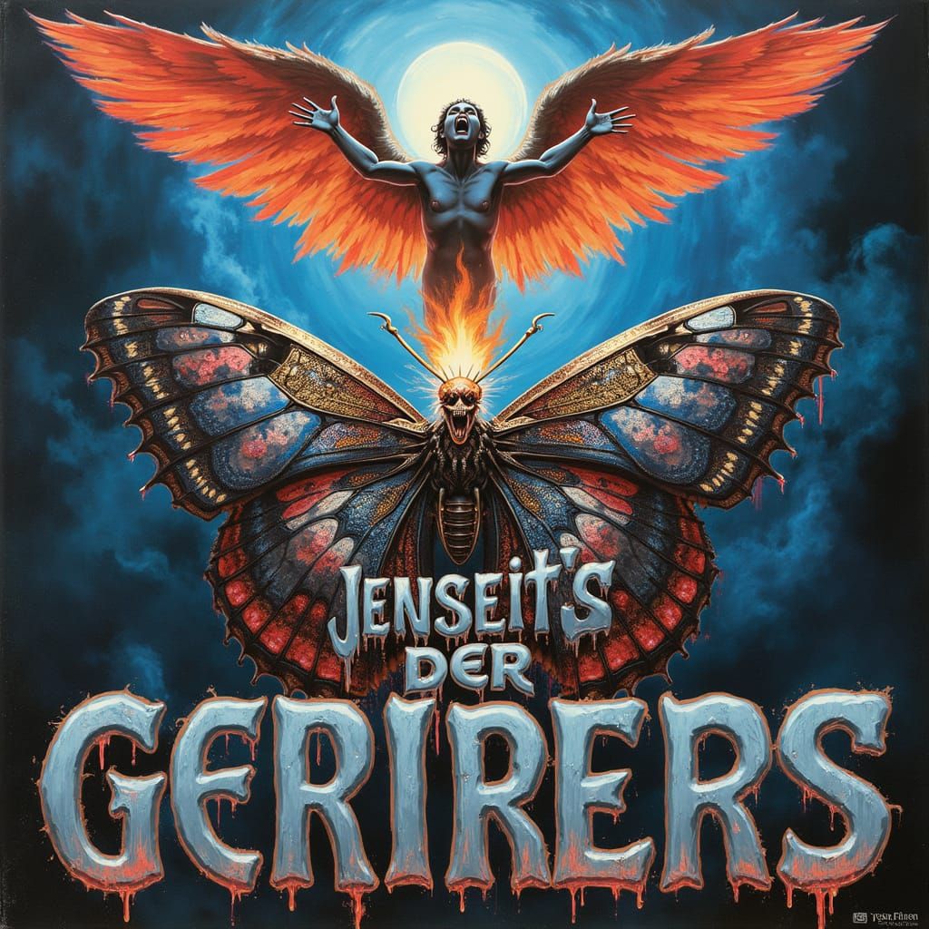 This image depicts a surreal, psychedelic LP cover featuring a bold, metallic silver title and a vibrant, alien-like butterfly emerging from a swirling vortex of colors, surrounded by angel and demon figures in a divine revelation scene, blending the styles of H.R. Giger, Ash Thorp, and ZdzisΕaw BeksiΕsk...