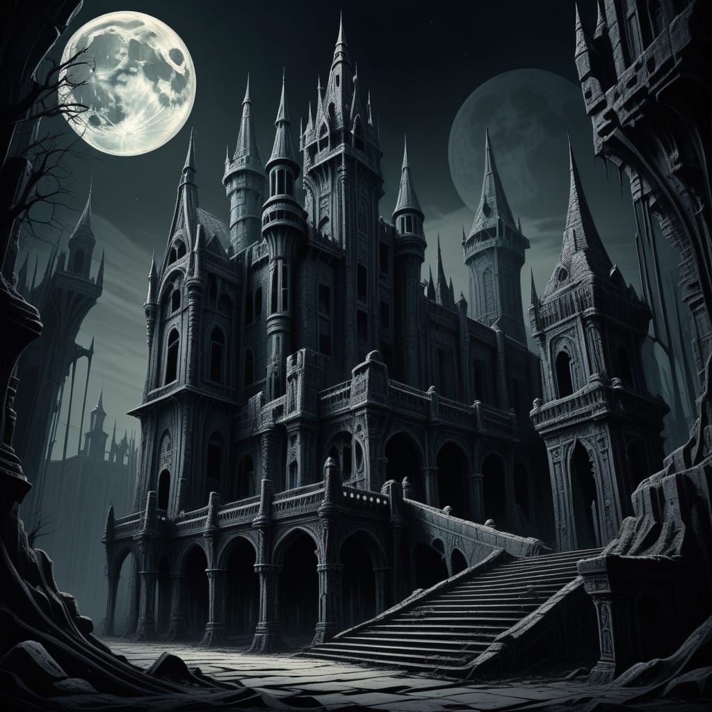 This image depicts a mysterious, decaying castle with detailed stone carvings under a spooky moonlit sky, rendered in a dark, surrealistic style.