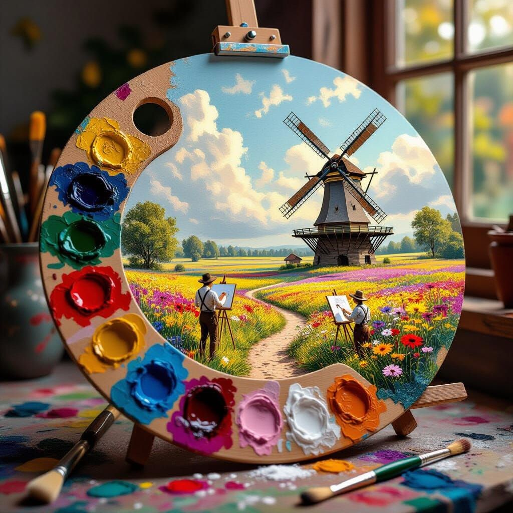 This hyperdetailed fantasy artwork showcases a painter's palette revealing a miniature landscape with artists, wildflowers, and a windmill. Features gritty texture and dramatic lighting in a contemporary illustration style.