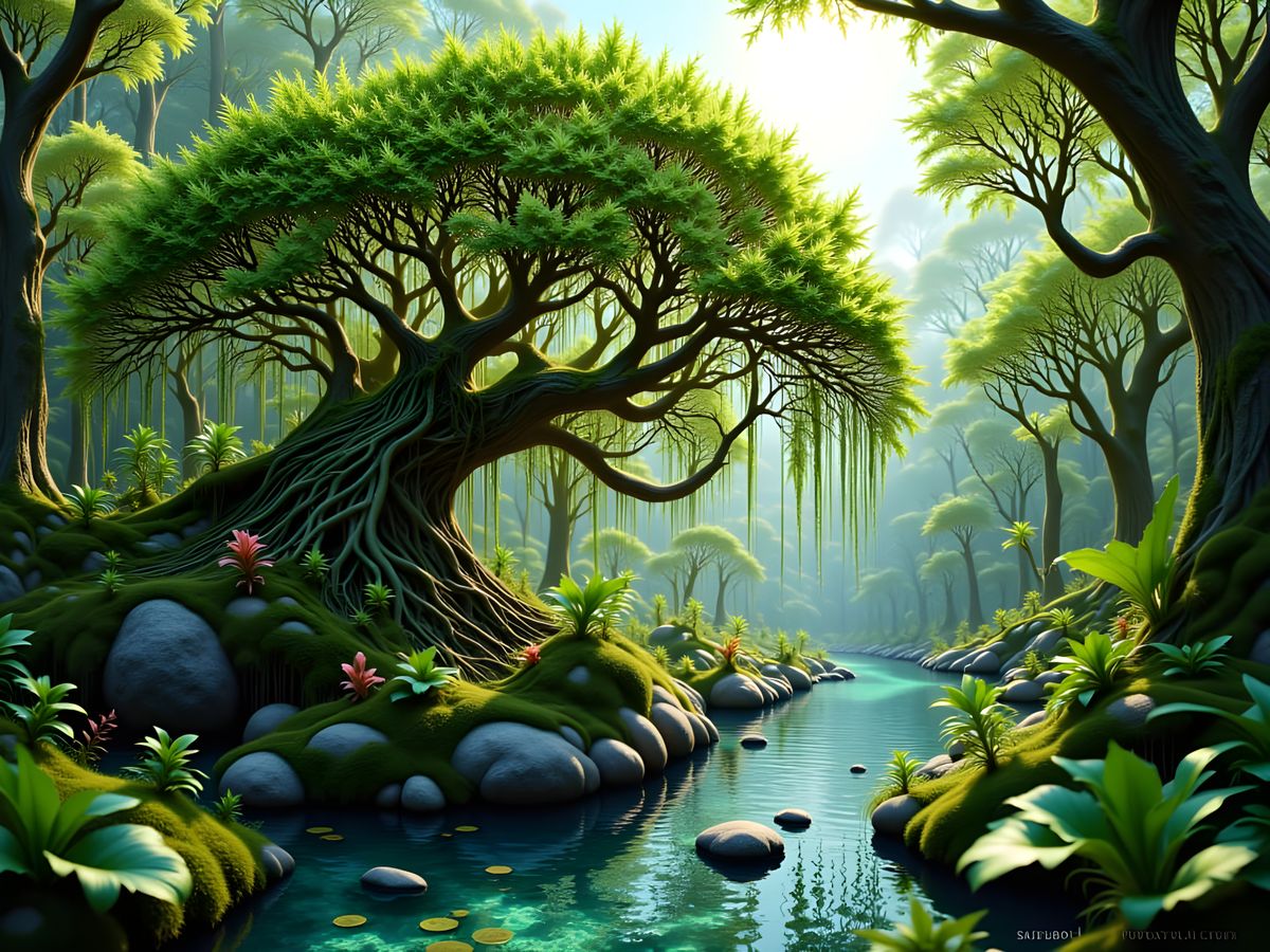A photorealistic image of an ancient, twisted weeping willow bonsai tree with plum fronds, growing on a mossy rock. Moonlight glimmers on a reflecting pool, with roots hanging down.