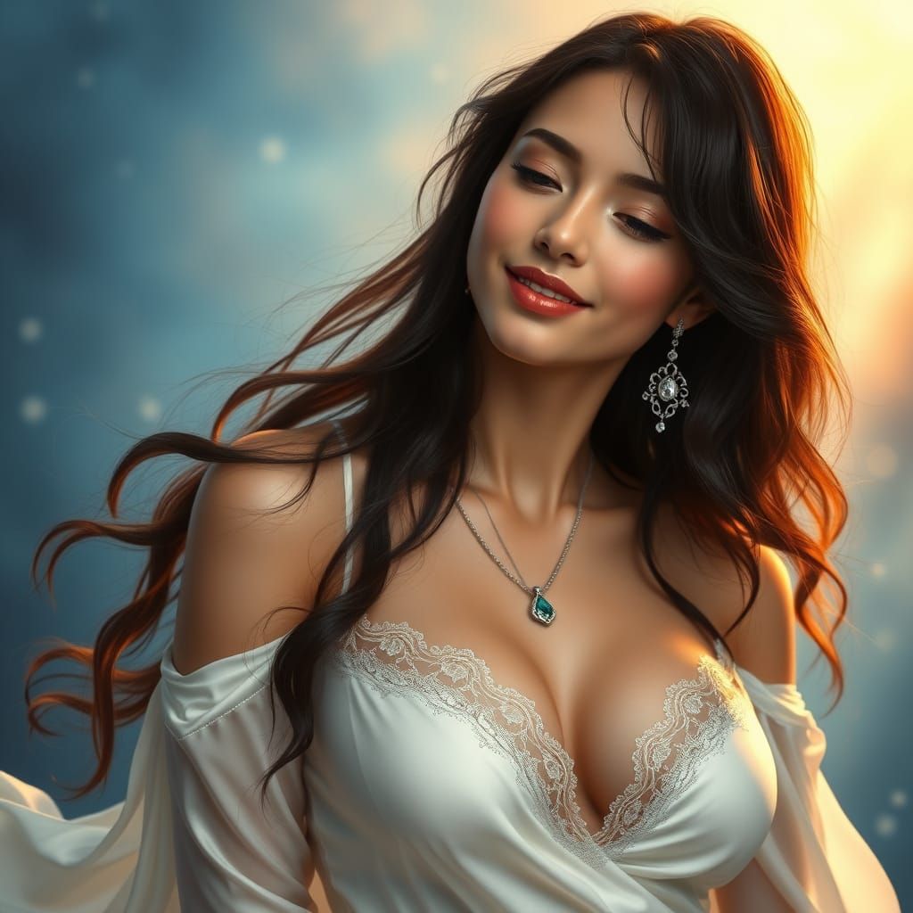 This image is a dreamlike portrait of a woman with raven hair and porcelain skin, wearing a delicate white silk bra top and sparkling diamond jewelry, set against a fantasy blue background with a warm, ethereal backlight, evoking a romantic aura and sense of wonder.