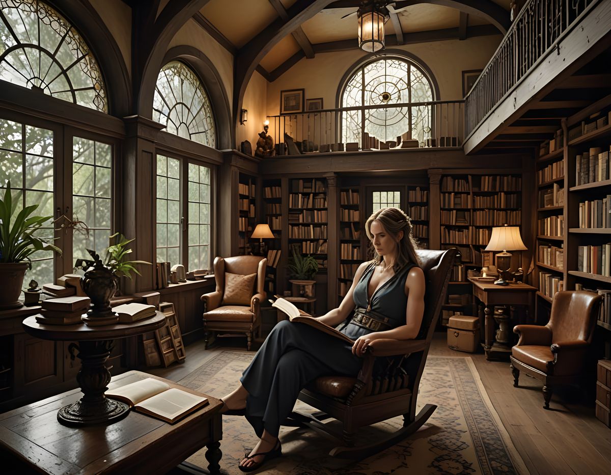 This image shows a peaceful antique bookstore circa 1700, complete with vaulted ceilings and endless shelves of aged books. A woman in a leather bikini sits in a rocking chair reading. Ultra-photography with hyperrealism and cinematic lighting.