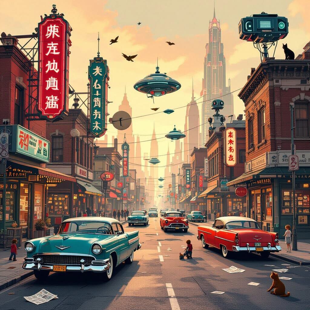 This image shows a sepia-toned 1950s street blended with futuristic elements. Retro cars and buildings meet hovering neon signs and robot postmen in an art deco and sci-fi aesthetic.