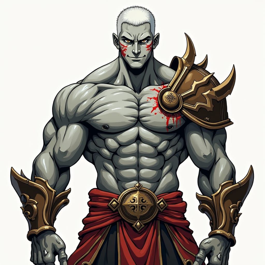 A striking image of a muscular, gray-skinned anime warrior. He has white hair, red tattoos, and brown and white armor. The character is rendered with detailed anatomical features in a manga style.