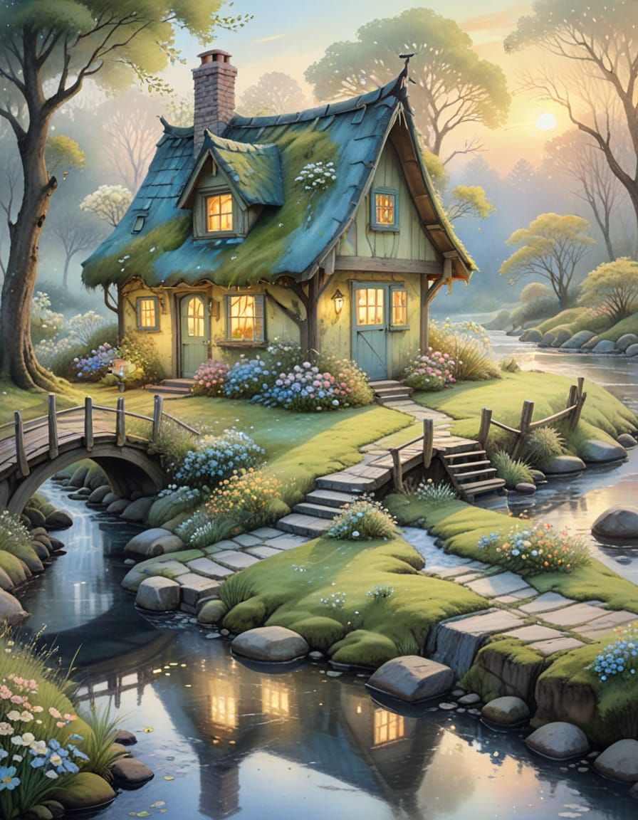 This image shows a detailed, atmospheric watercolor painting of a crooked wooden cottage with a mossy roof next to a brook. Soft mist and pale sunrise light create a fantasy feel.