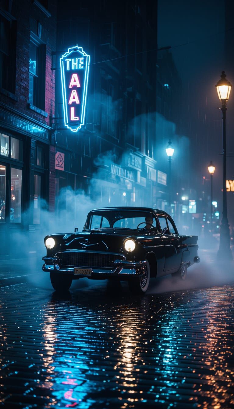 A vintage black car drives through fog on a wet, cobblestone street illuminated by neon lights and streetlamps, creating a mysterious, cinematic atmosphere in a film noir style.