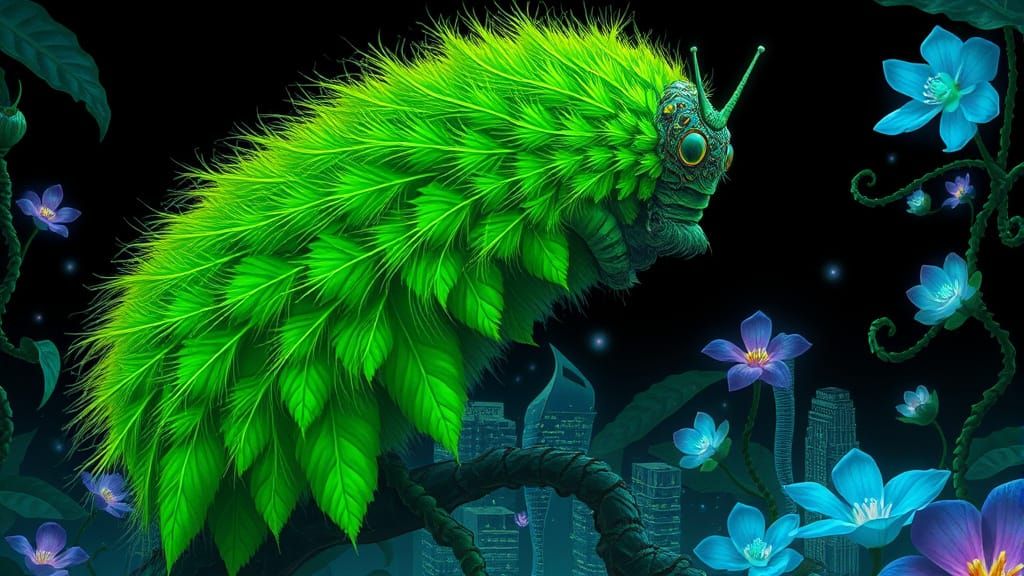 A colossal, furry caterpillar draped in luminous foliage devours a vine-covered skyscraper. The scene is set in a dark cityscape illuminated by radiant flora, rendered with hyperrealistic detail.