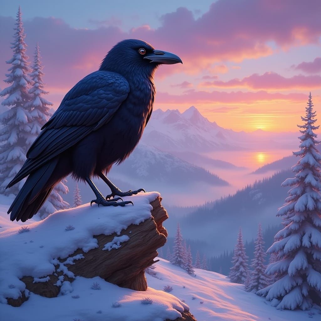 A majestic raven sits on a snowy log, overlooking a misty valley. This image showcases a detailed fantasy art style with deep colors and a soft pastel winter sunset.