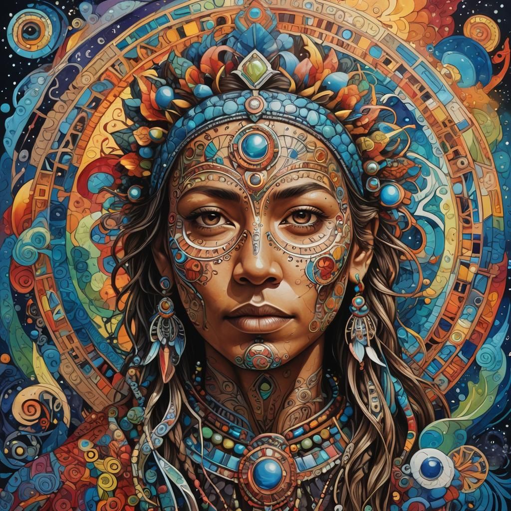 A vibrant, detailed image representing shamanic art with fractal and quantum elements. The artwork features a colorful and intricate design with a focus on depth and dramatic lighting.