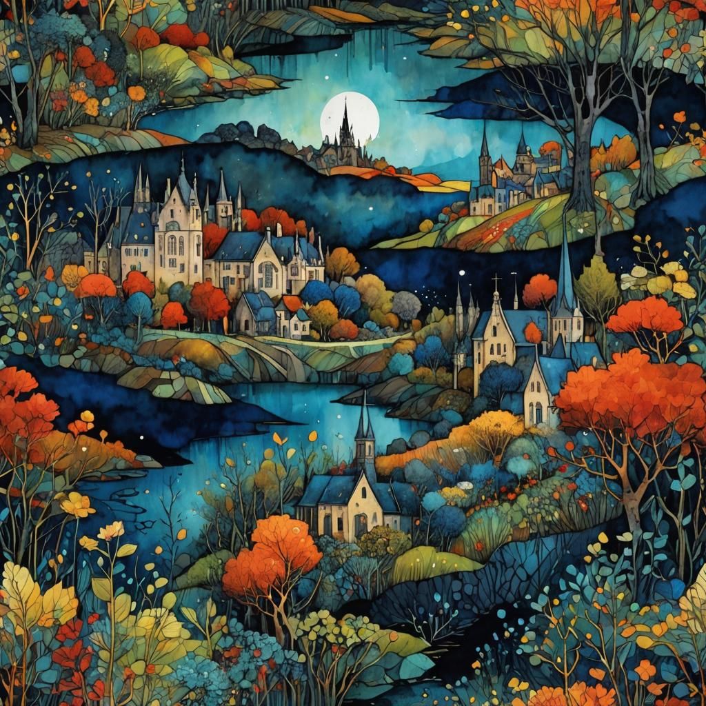 A vibrant landscape rendered in art brut style. This digital illustration features liquid ink watercolor with rich, warm colors, creating a powerful and energetic composition under natural lighting.