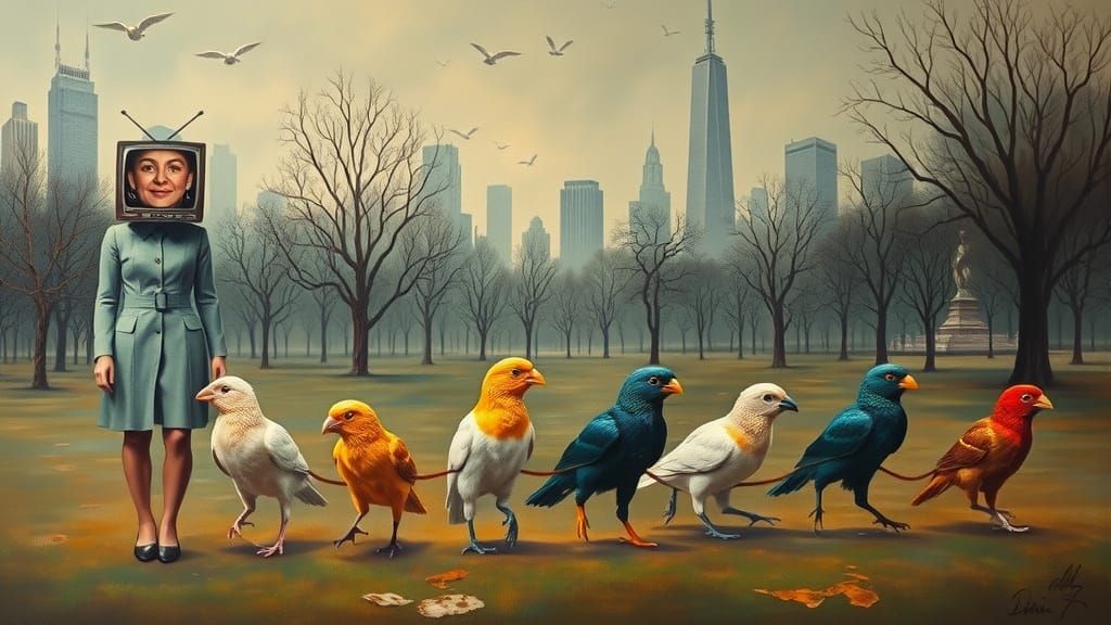 This image depicts a surreal city park scene featuring individuals with television heads showing their faces, walking colorful birds on leashes. The scene is set against a melting, matte background, characteristic of surrealist art.
