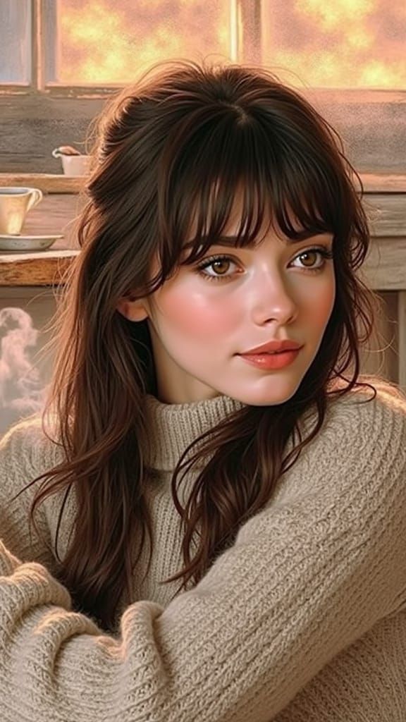 This image shows a beautiful woman with chestnut hair in a cozy cafe, bathed in warm sunlight. Rendered in a richly textured oil painting style with soft edges and atmospheric lighting.